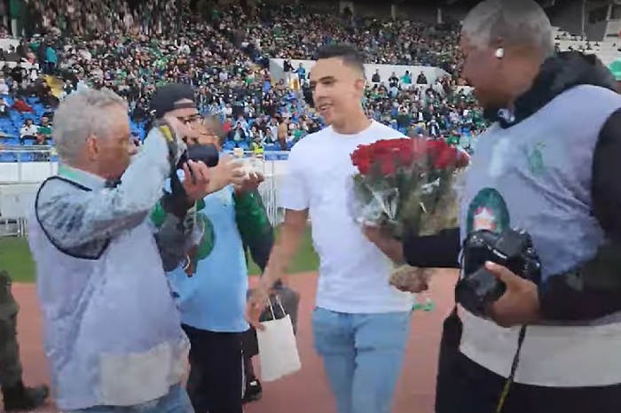 وتوحّدت مدرجات "استاد محمد الخامس" في التصفيق لابن الـ26 عاما، والهتاف باسمه، كما قام رحيمي بدوره بإهدائها باقةً من الورود.