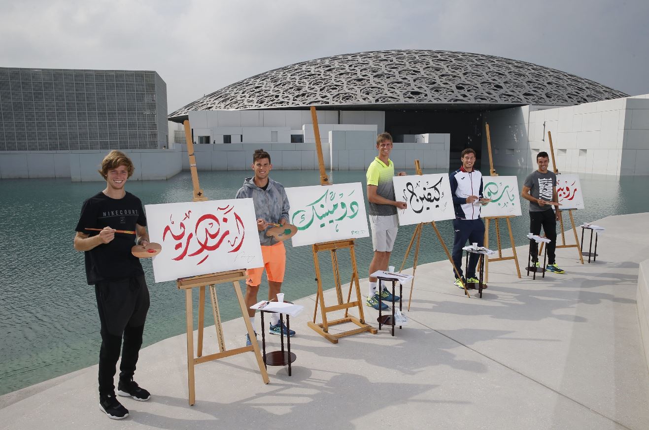 فيما يبرز متحف اللوفر أبوظبي في الخلفية، حاول كل من (من اليسار إلى اليمين) نجم التنس الصاعد الروسي أندري روبليف الذي لم يتجاوز عمره 20 سنةً؛ ودومينيك تيم المصنّف خامساً؛ والجنوب أفريقي كيفن أندرسون؛ وبابلو كورينو بوستا، الذي وصل إلى مباراة نصف نهائي بطولة أمريكا المفتوحة للتنس؛ والإسباني روبيرتو باوتيستا آجوت؛ كتابة أسمائهم باللغة العربية.